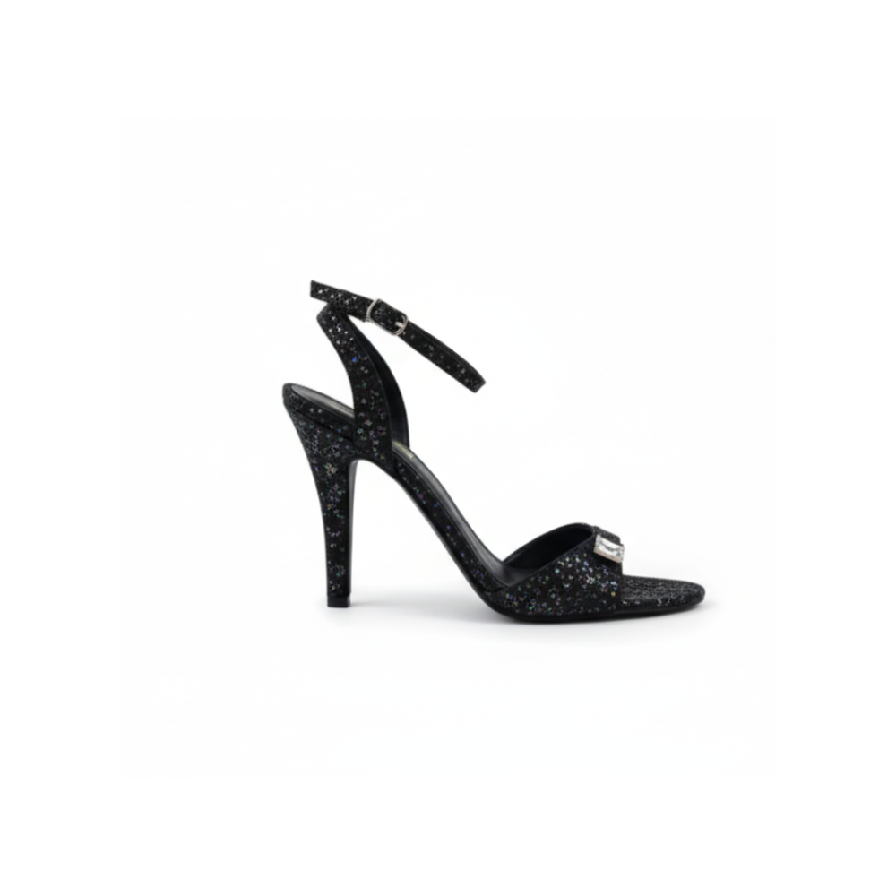 Step into elegance with these black high-heeled sandals, designed with a sleek slingback strap and a secure buckle closure. The sandal features a sparkling starry-glitter finish, adding a touch of glamour to every step. A chic metallic embellishment on the front strap enhances its modern appeal, while the slim stiletto heel provides a sophisticated silhouette. Perfect for evening parties, weddings, and festive occasions, these sandals combine style with statement-making charm.